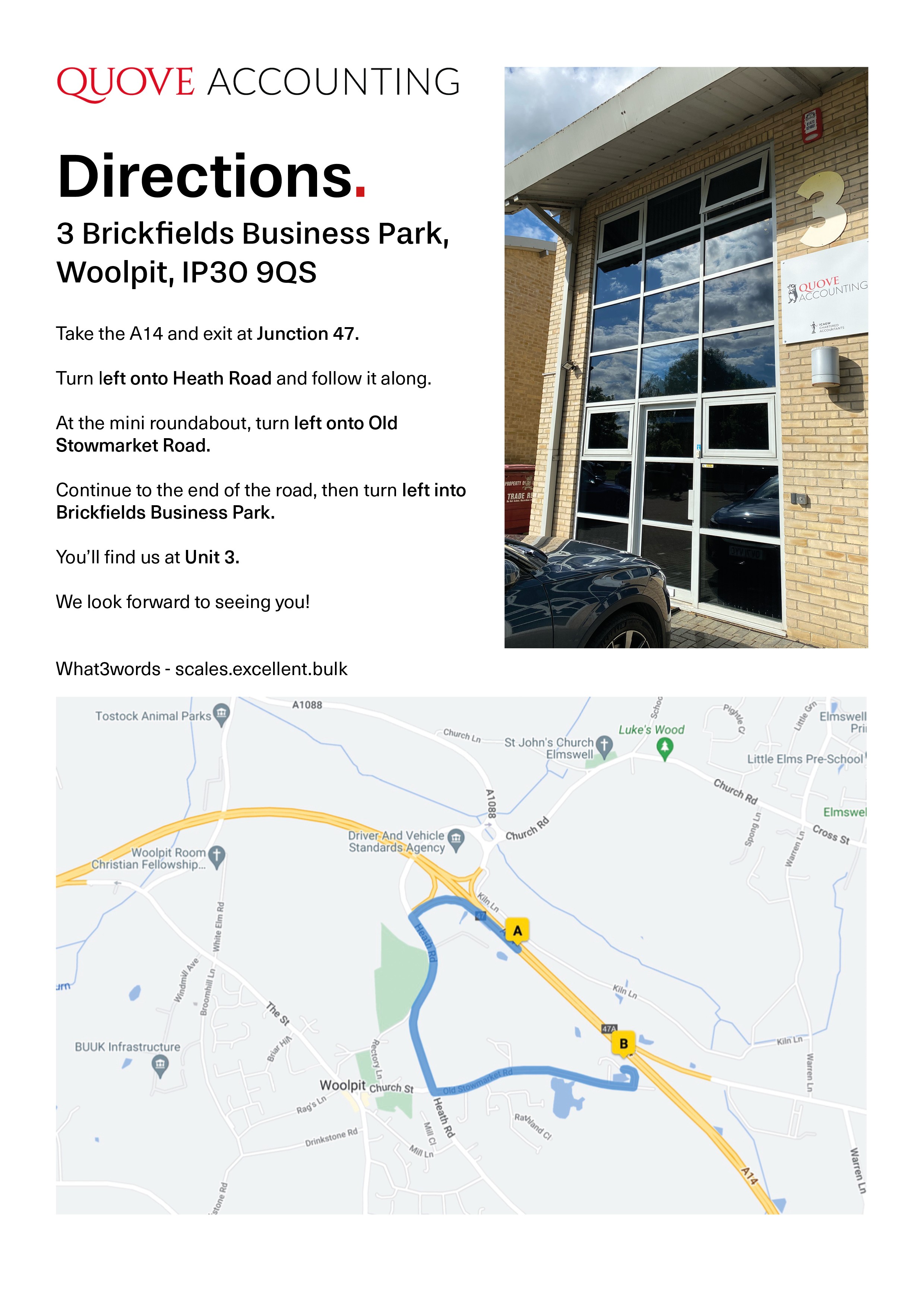 Our office is based in Woolpit, just off the A14 west of Stowmarket. Free parking is available onsite.