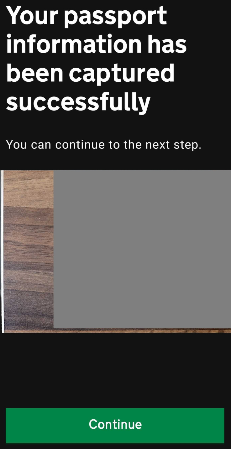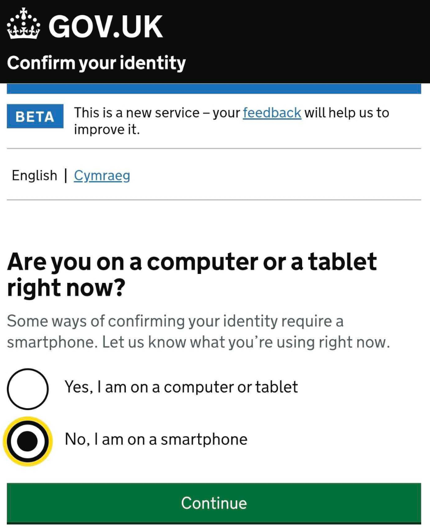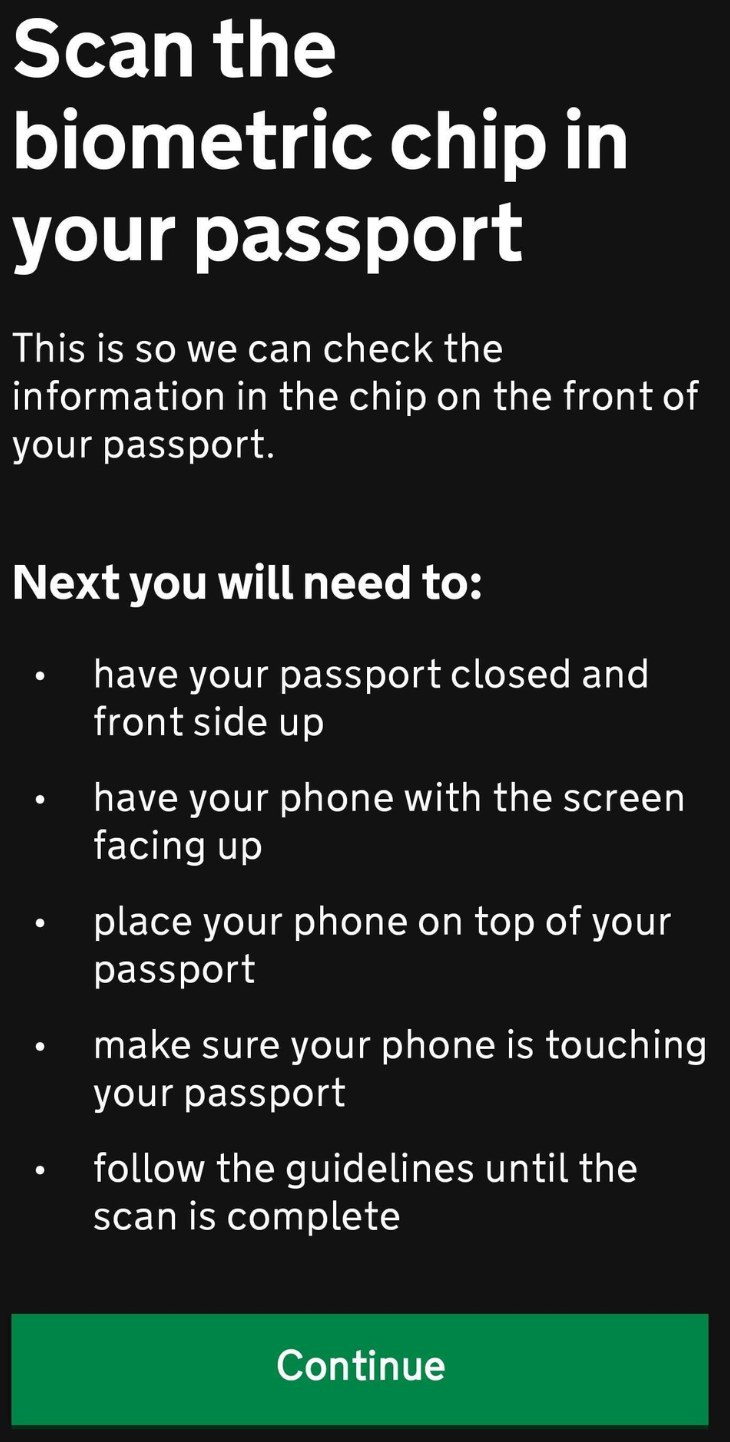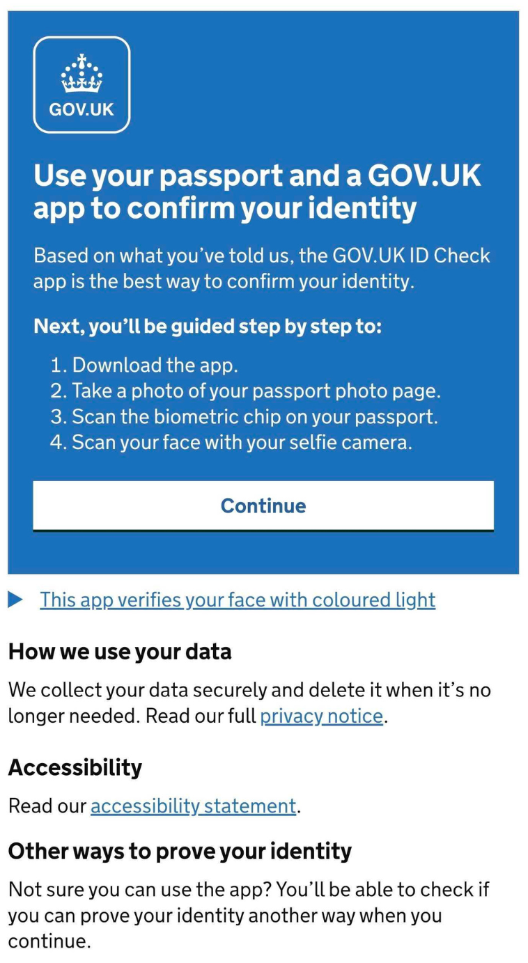 Click Continue to use your passport and the ID Check app to verify your identity.