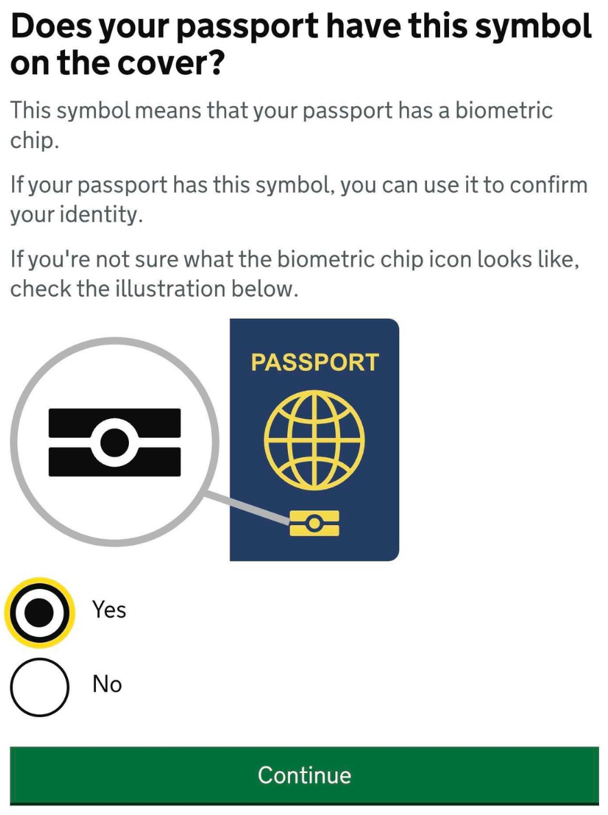 Confirm if your passport is still valid or not, and continue. You’ll then be asked to confirm whether your passport has a biometric chip symbol.