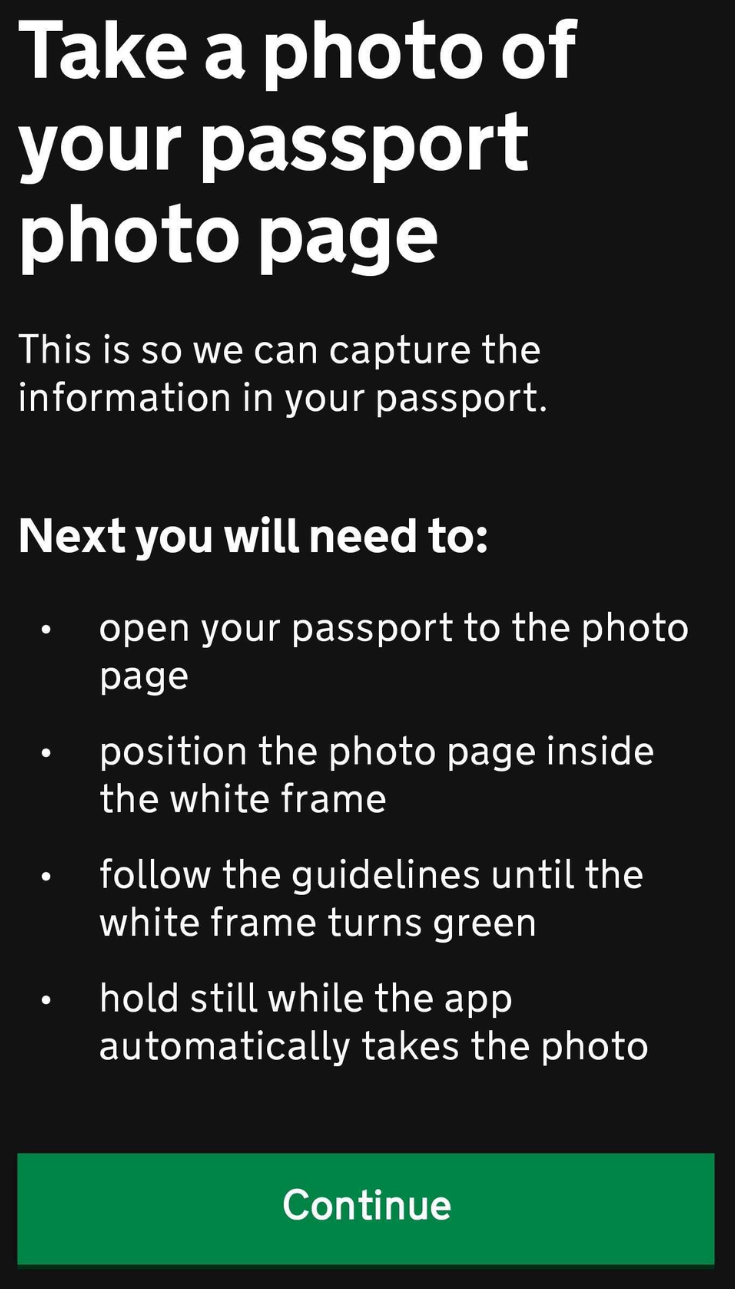 Take a picture of your passport photo page and click Continue.