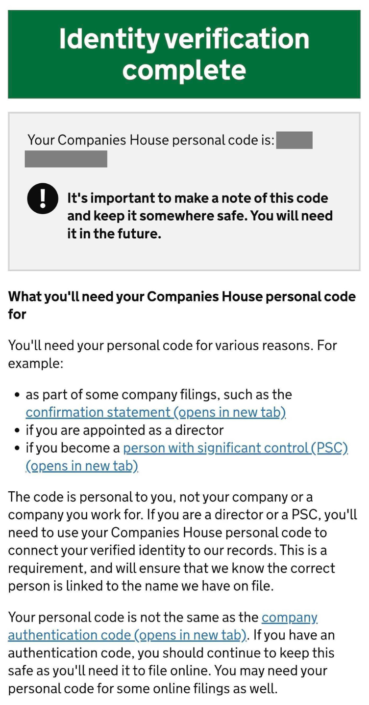 The following page should state Identity verification complete, signalling the end of the verification process. For future need, ensure you keep your Companies House personal code to hand.