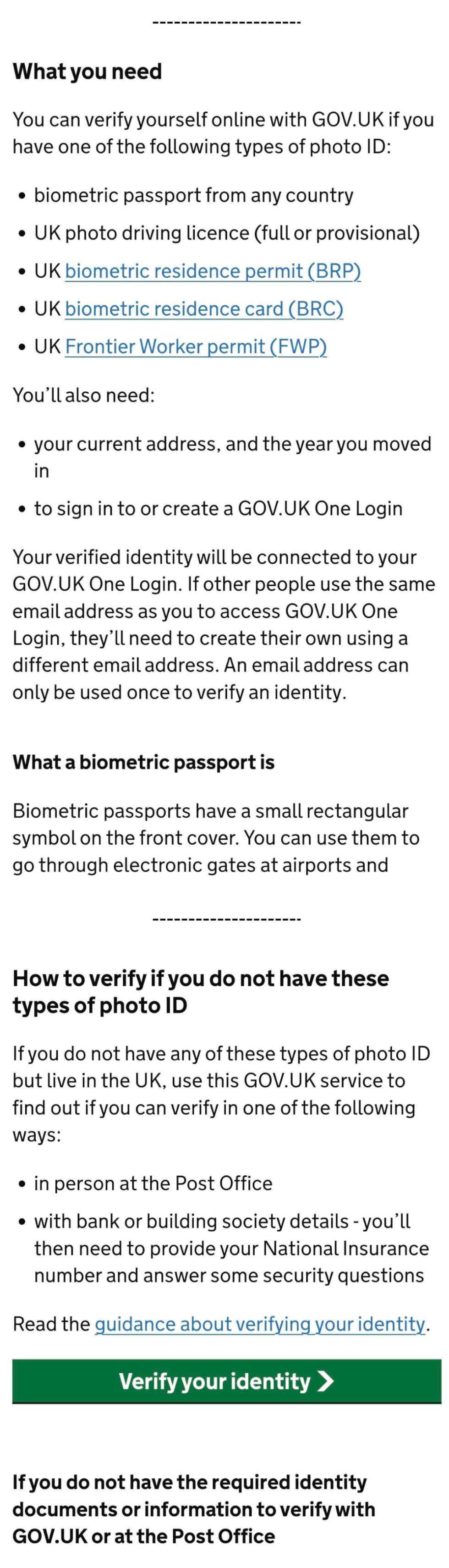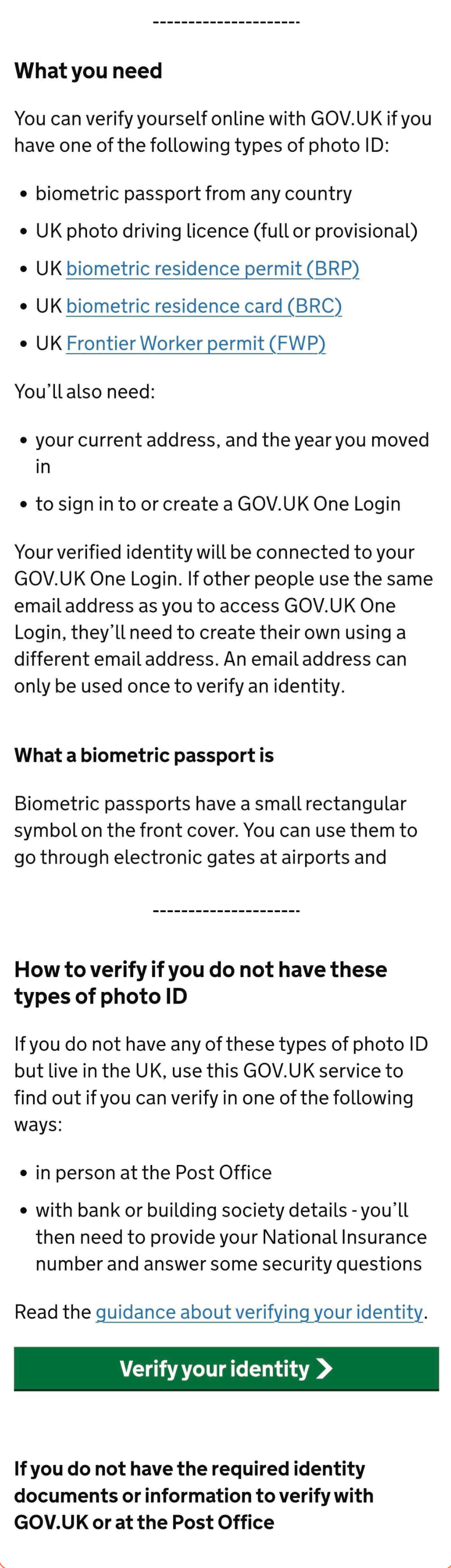 Scroll down the page, have a look at what photo ID you’ll need and click Verify your identity.